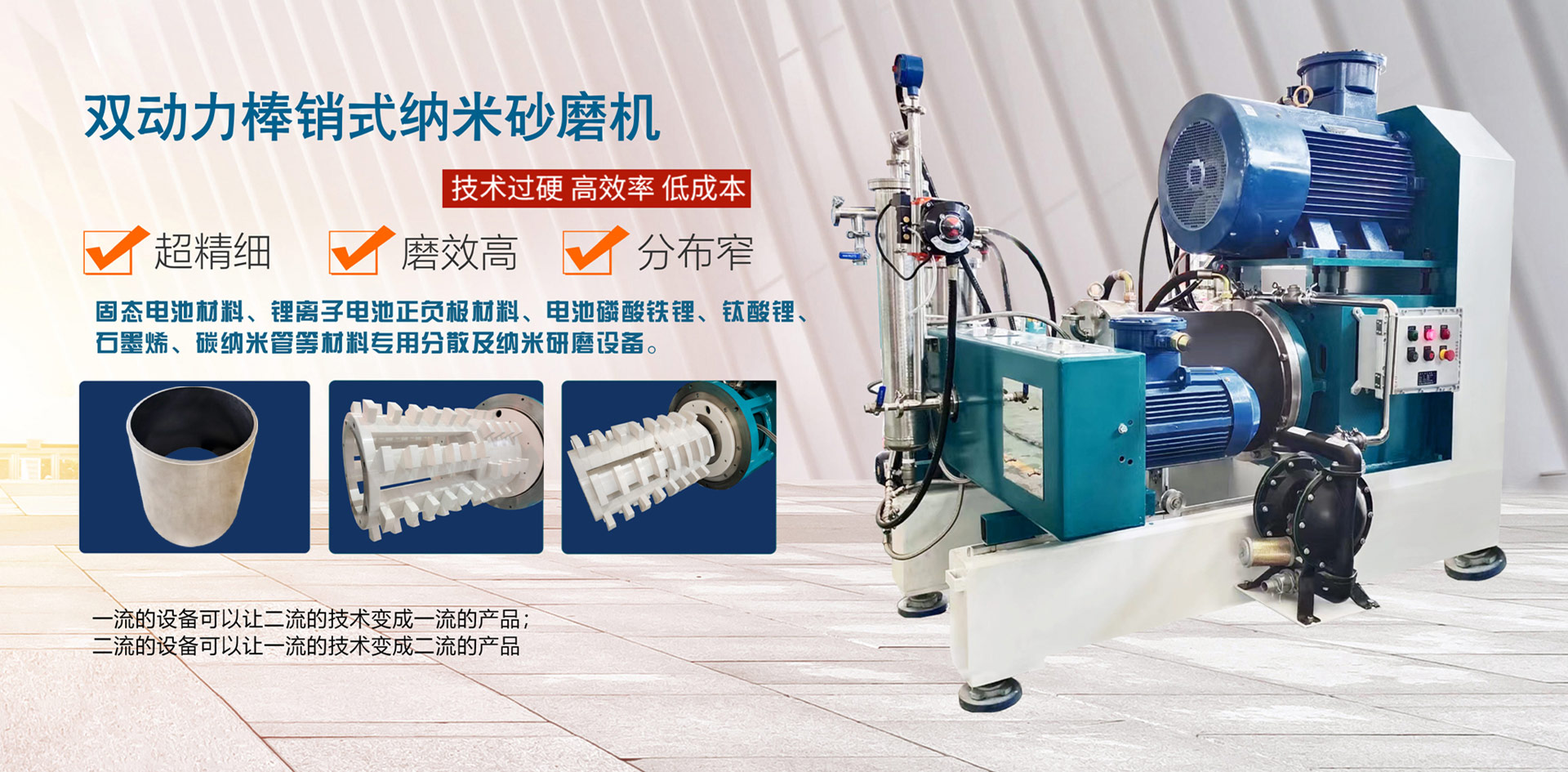 馳勒(上海)機械科技有限公司是是一家專注分散、研磨、攪拌、乳化及成套生產(chǎn)線解決方案的供應商,公司總部位于東方明珠之城—上海。企業(yè)集研發(fā),生產(chǎn)、銷售、設(shè)計、施工為一體。主要產(chǎn)品有:直驅(qū)節(jié)能棒銷砂磨機、棒銷式臥式砂磨機、雙動力棒銷式納米砂磨機、渦輪納米砂磨機、立式納米砂磨機、實驗室納米砂磨機、行星攪拌機、三輥研磨機、反應釜、高速分散機、真空均質(zhì)乳化機、成套生產(chǎn)線等產(chǎn)品 迄今為止,公司已為國內(nèi)輸出數(shù)萬臺合格設(shè)備,廣泛應用于磷酸鐵鋰、磷酸錳鐵鋰、鋰電三元高鎳、導電劑、石墨烯復合漿料、隔膜、電池涂覆、硅碳負極、電池材料、導電漿料、CMP拋光液、5G陶瓷粉體材料、數(shù)碼墨水、涂料、油墨、樹脂、特膠例5水、光伏產(chǎn)業(yè)的鋁銀漿、農(nóng)藥、潤滑油、助劑、陶瓷/玻璃、電子漿料、納米材料、油漆、色漿、潤滑脂、醫(yī)藥、顏料/燃料、化妝品、食品、膠黏劑/密封劑、礦石/礦物/金屬、熒光增白劑、纖維素/紙漿、微電子及半導體、農(nóng)用化學品、生物科學、科研/教學等高端領(lǐng)域,并取得了廣大客戶的一致好評。 馳勒機械一直深耕于濕法研磨行業(yè),深知只有專一才能專業(yè)的道理,力求做精做專,秉承為客戶提供專業(yè)的精細研磨解決方案,推薦合適的納米級、亞微米級研磨設(shè)備。為您創(chuàng)造更多、更高的價值。